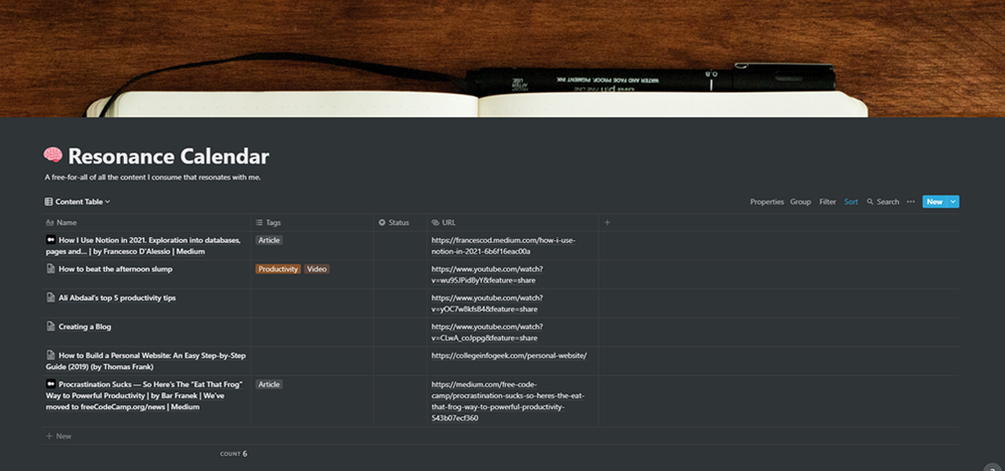 If you have a piece of content that resonates with you in any way then this is the template for you! Based on Ali Abdaal's simple resonance calendar, here is my take on a simple place to capture content!