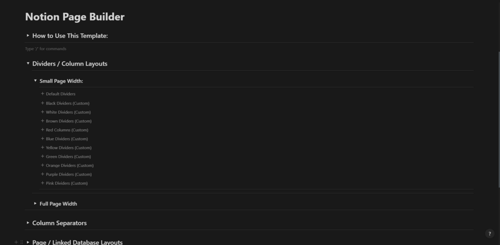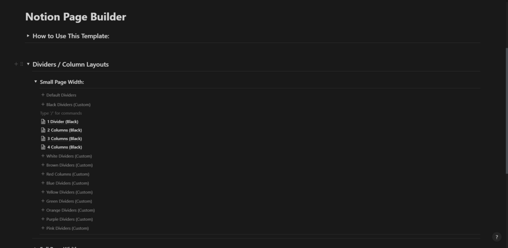 Do you struggle with constantly having to set up new page layouts in Notion? Save hours of time by using my custom-made Notion Page Builder! This template will give you access to every column layout imaginable in a wide variety of colors! You also will receive many custom templated page layouts to get your Notion setup started!