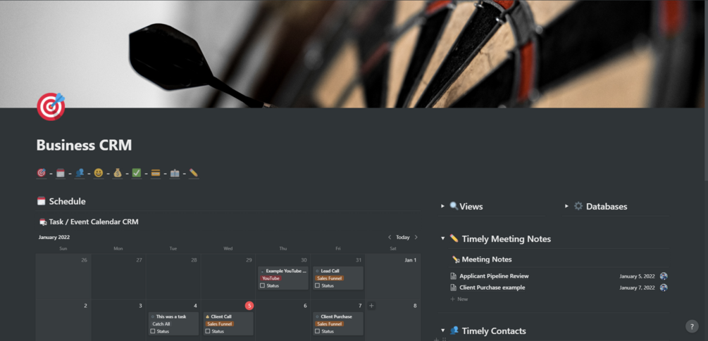 This Business CRM is one of my favorite templates! It comes equipped with task management and a dashboard to see your schedule, who you need to contact and related note-taking systems to stay up to date with all your customer relationship needs.